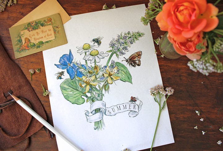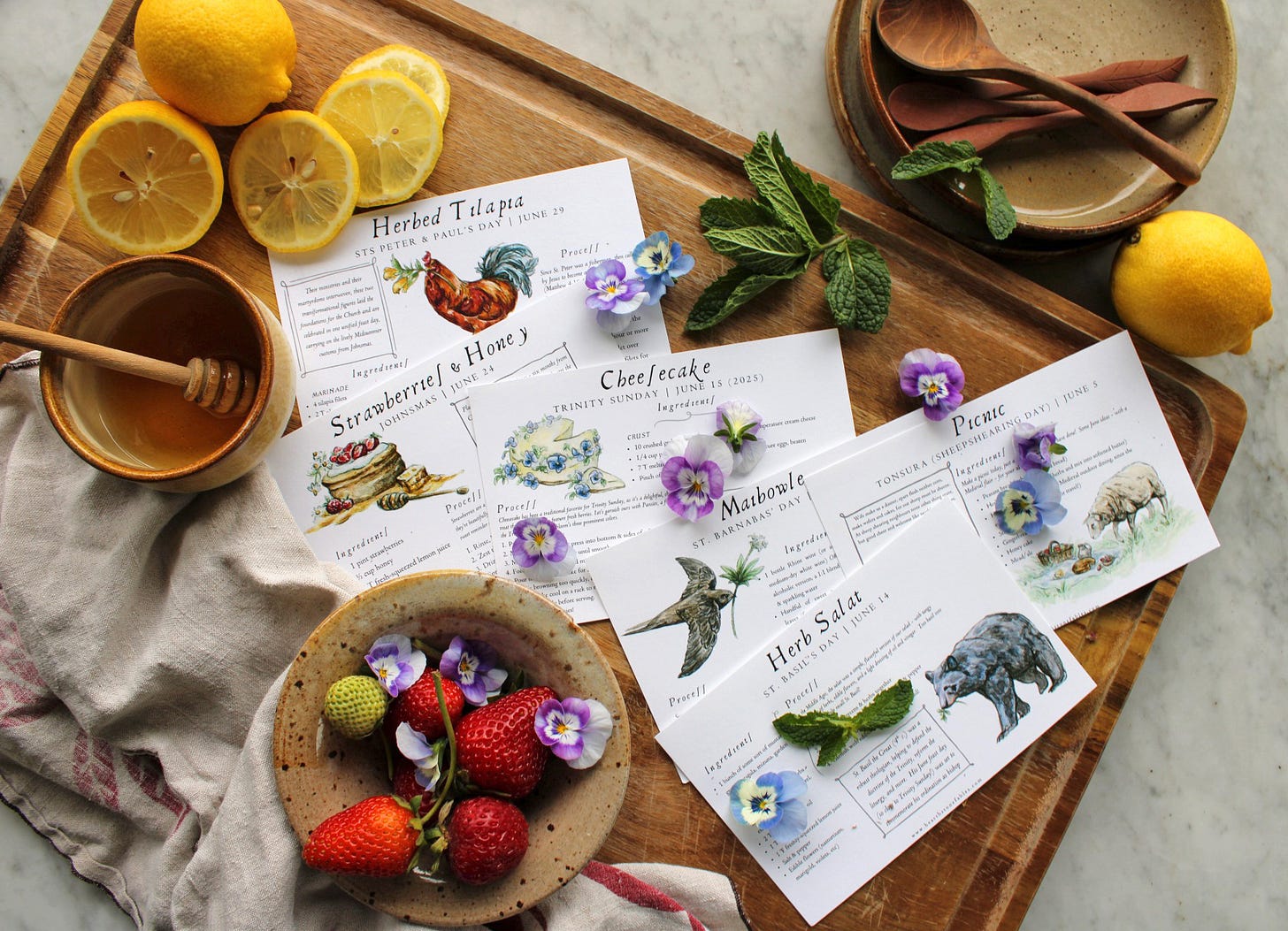 This summer, you’ve gathered binder supplies and collected some of the hodge-podge of summertime resources that have special meaning in your life and your landscape: pressed Midsummer flowers, a strawberry shortcake recipe clipped out of magazine, a child’s drawing… and you’ve sifted those materials into a few piles, considering how they might relate seasonally to a few different feasts this summer.