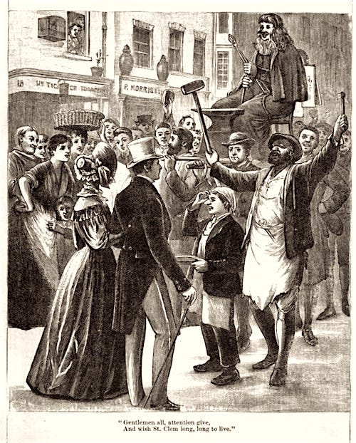 The local Blacksmith guilds also adopted Clementing (with St. Clement - “Old Clem” - being their patron saint, recalling the anchor that was the instrument of his martyrdom). They would process around town with an effigy of Old Clem6 held aloft, singing and begging for money; everything they collected went toward a Clem Supper for their guild that evening.