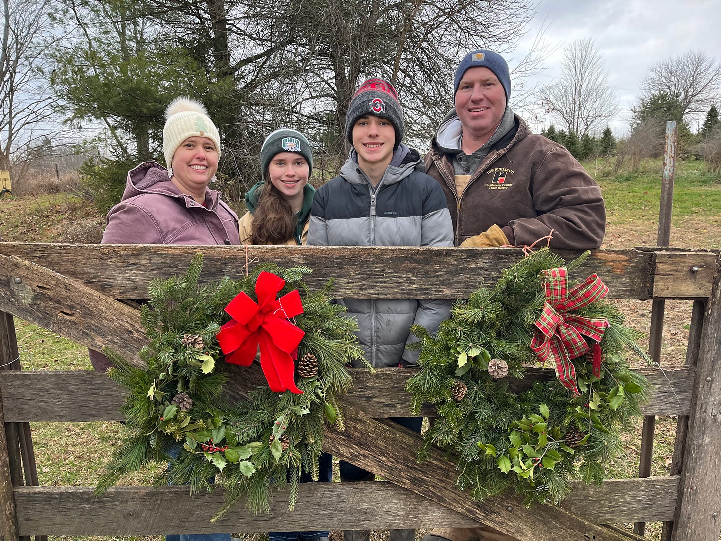“We are third generation Christmas tree farmers, and will be selling trees from our farm sometime in the next few years. My parents are a mile down the road from us, and planted their first trees in 1981. My maternal grandparents had a Christmas tree farm in northeast Ohio. Also, my uncle has a tree farm in Pennsylvania and my sister is growing Christmas trees in West Virginia. We helped out on my grandparent’s farm until my parent’s trees were big enough to sell, then our Decembers were devoted to selling trees at home. It takes about 8-10 years from when seedlings are planted until they are ready to harvest. In between comes much mowing, pruning, and pest control. I also started making wreaths as an FFA project in high school. A couple years ago I decided to try holding wreath classes, where people could come make and decorate their own wreaths, and that has been a fun and successful project (and tiring!).