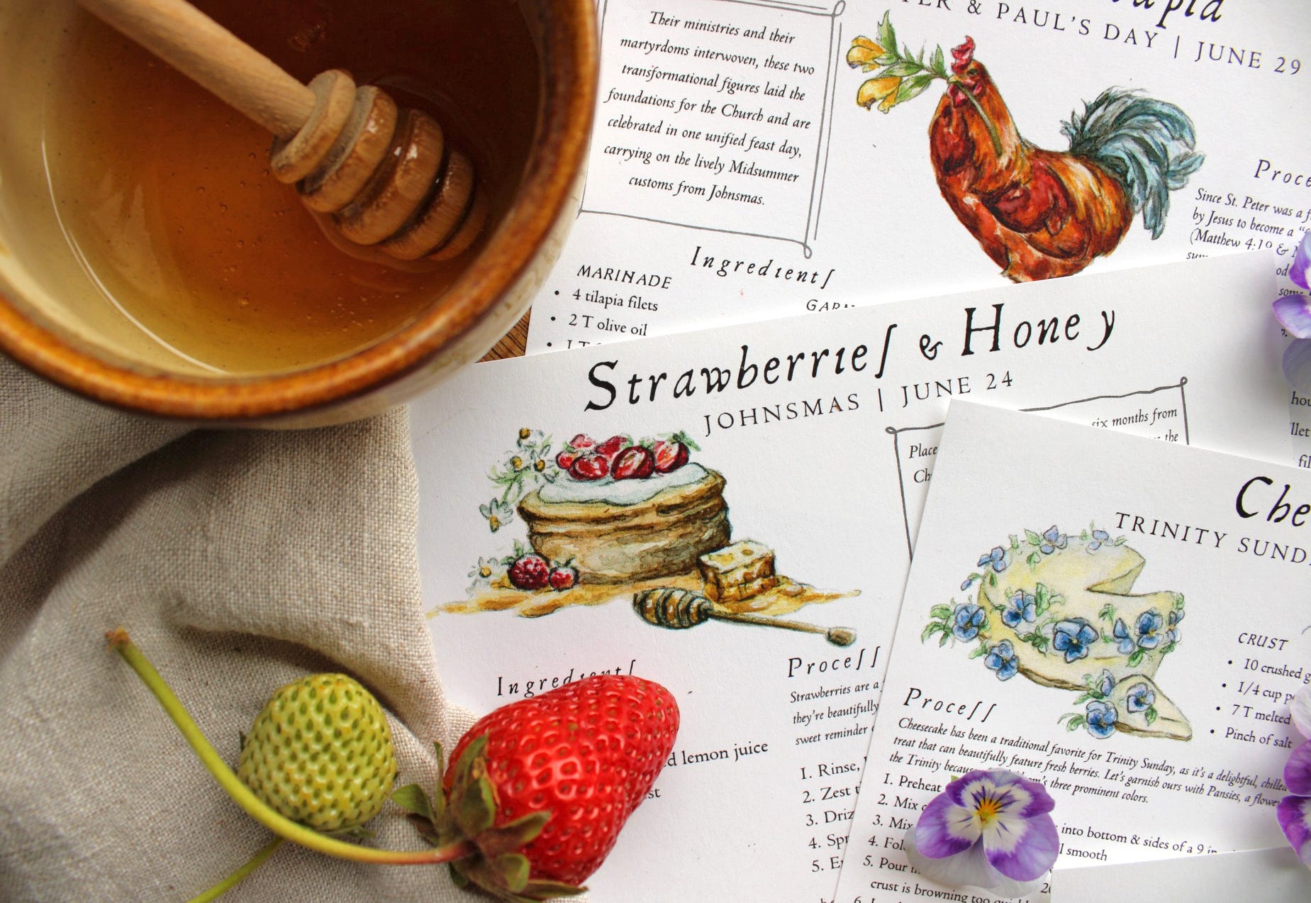 To help give you some fun (and simple) ideas for your June feasts, I made a handful of recipe cards with sweet illustrations - each one has a quick blurb about the holiday to give you a starting point, as well as some brief connections with the food being featured.