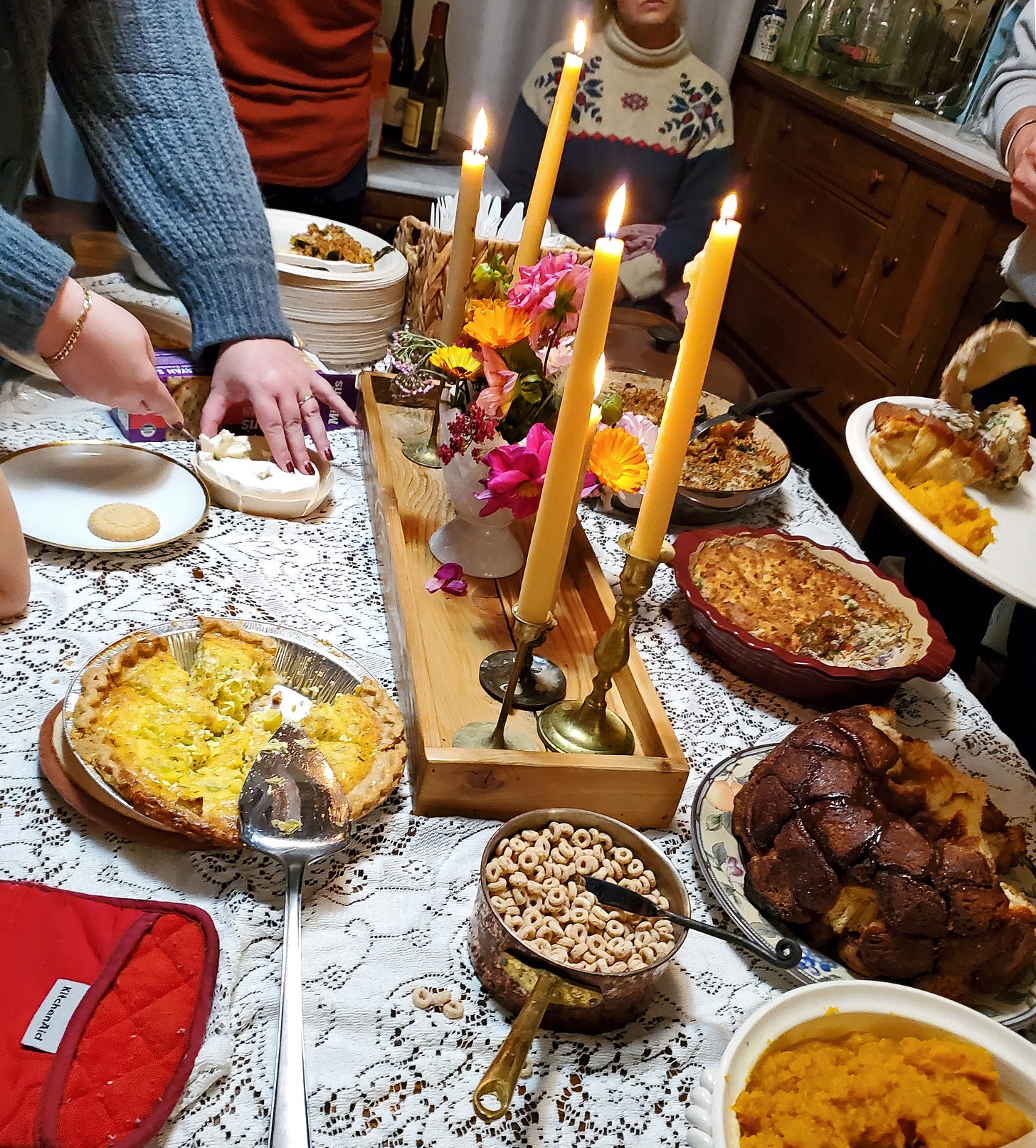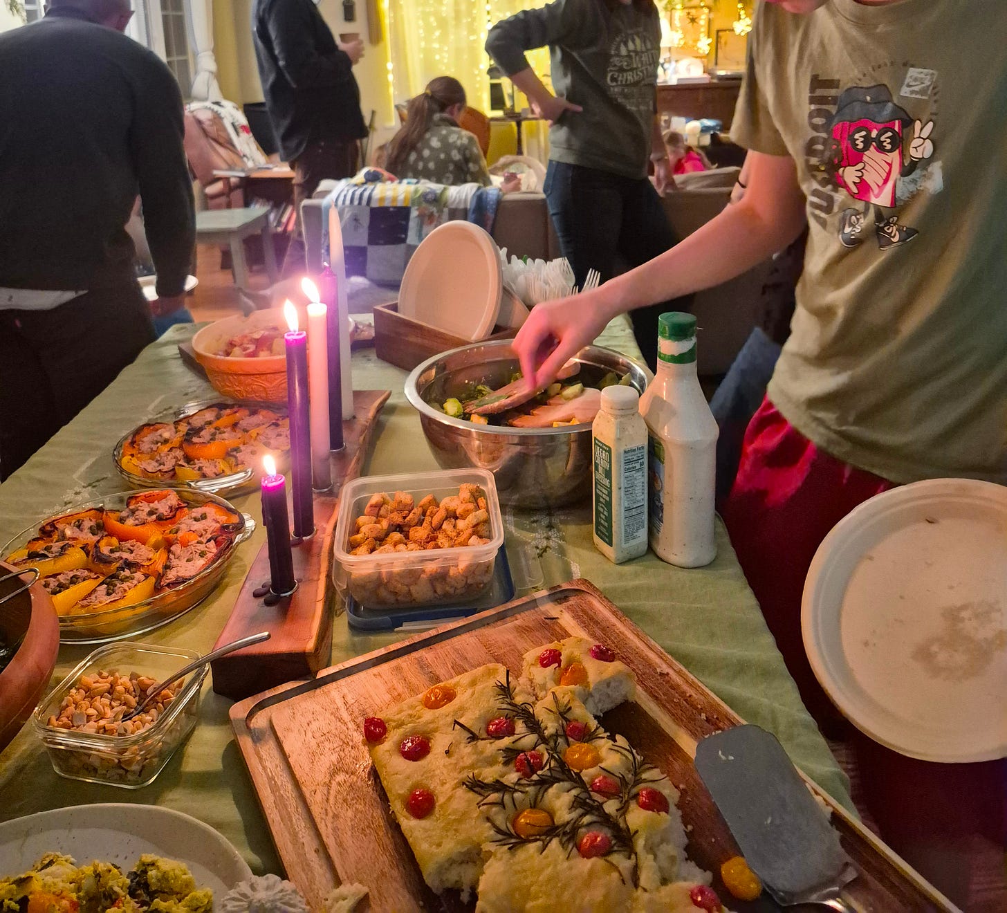 Meal Theme: I like to provide some sort of potluck theme to help prompt us all…i.e., food traditionally associated with a particular feast, food from regions associated with that saint, etc. But here’s the crucial part: I tell folks to bring what they want, in or out of the theme, and only bring it if they can. The theme is provided to help spark ideas and excitement, to help us all learn…but it’s not meant to be legalistic or be a burden. (For St. Catherine’s Day, our theme was “circular” food - and I was delighted that a friend brought Cheerios. Brilliant!) Sometimes, we just don’t have the bandwidth to do anything but bring ourselves to a gathering, and that’s okay.1 I also usually have a Pinterest board to point friends to…just a place to peek around and get ideas.