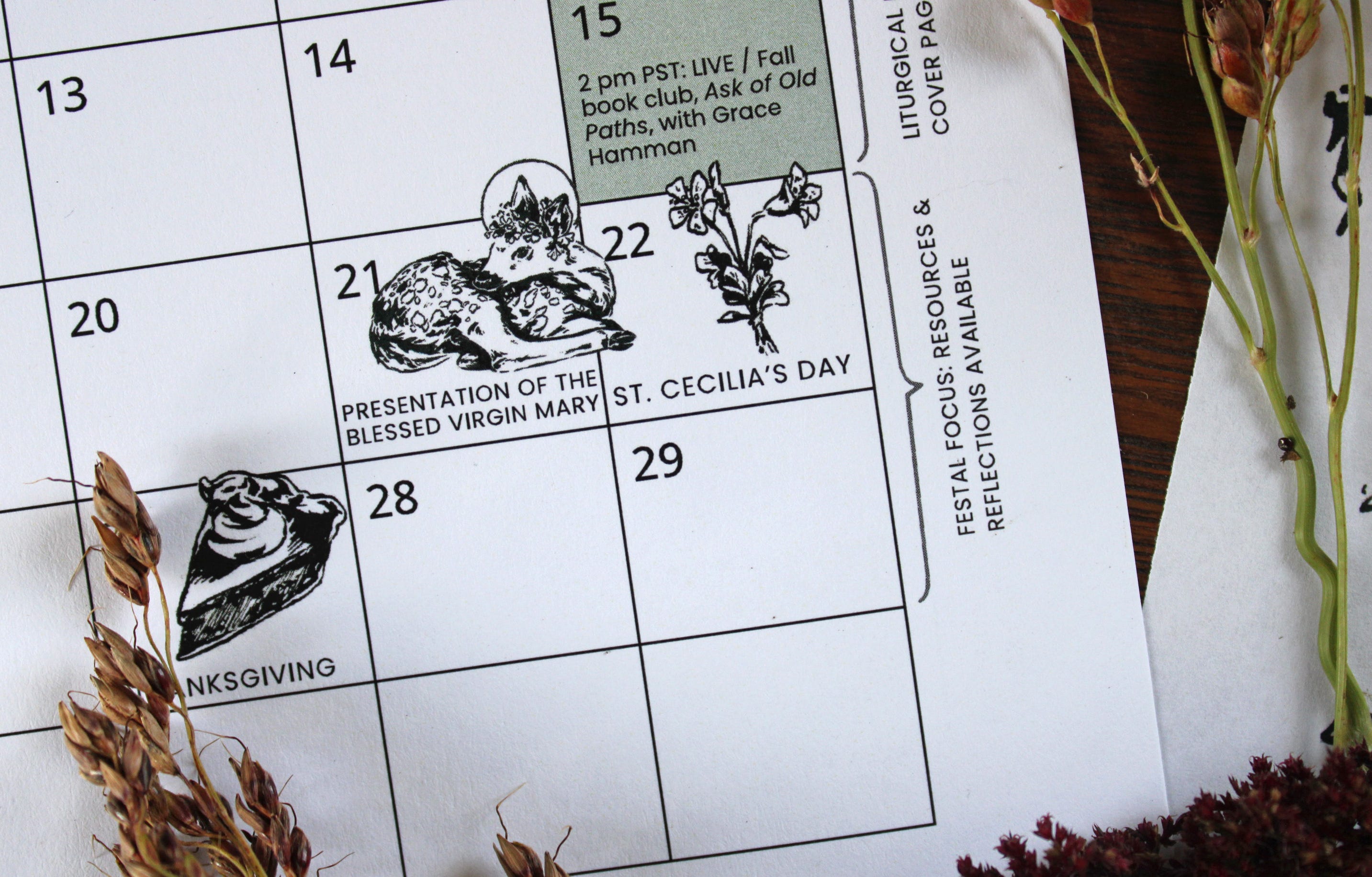In each Almanac, you’ll find a ‘book of days’ to track this month’s HF gatherings & resources…a reveal of our monthly in-depth focus…a printable Almanac to prompt feasting & fasting during our November days…and a playlist to serenade.