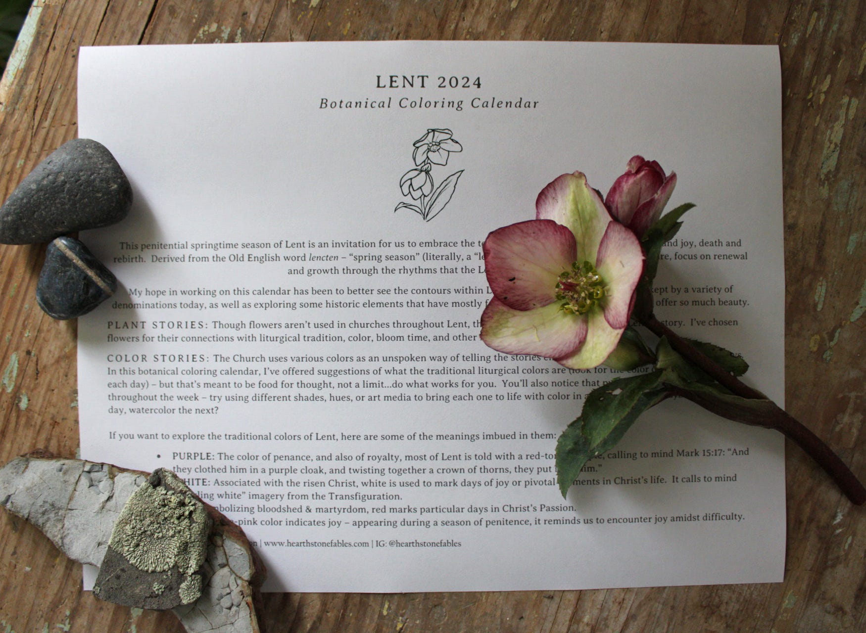 COLOR STORIES: The Church uses various colors as an unspoken way of telling the stories embedded in different seasons and holy days. In this botanical coloring calendar, I’ve offered suggestions of what the traditional liturgical colors are (look for the color of the text used for each day) – but that’s meant to be food for thought, not a limit…do what works for you. You’ll also notice that purple flowers are repeated throughout the week – try using different shades, hues, or art media to bring each one to life with color in a different way. Maybe crayons one day, watercolor the next?