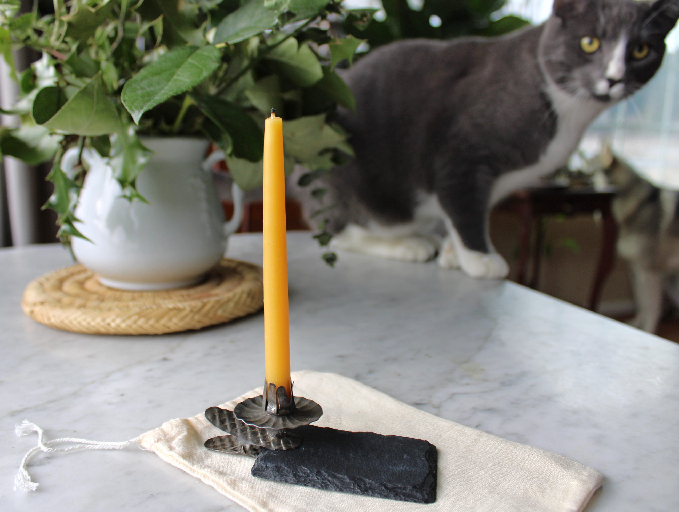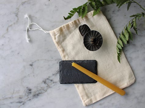 This season of darkness and colder temperatures provides so many unique challenges: here in the PNW, the gray is low and long. In the winter box, I sent a bag of goodies so that, from afar, we can all ‘gather’ in prayer, lighting a candle in the midst of darkness. Included in the Winter box are a vintage/antique candle clip, hand-dipped beeswax candle (hand-dipped by our friends/beekeepers Peter & AmyBeth), and mini slate.