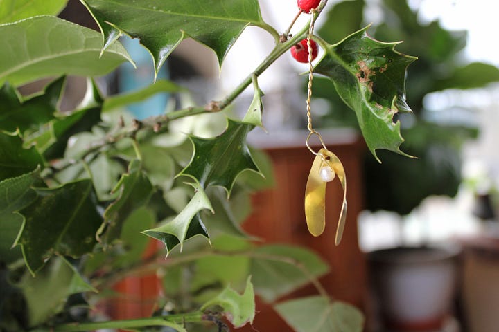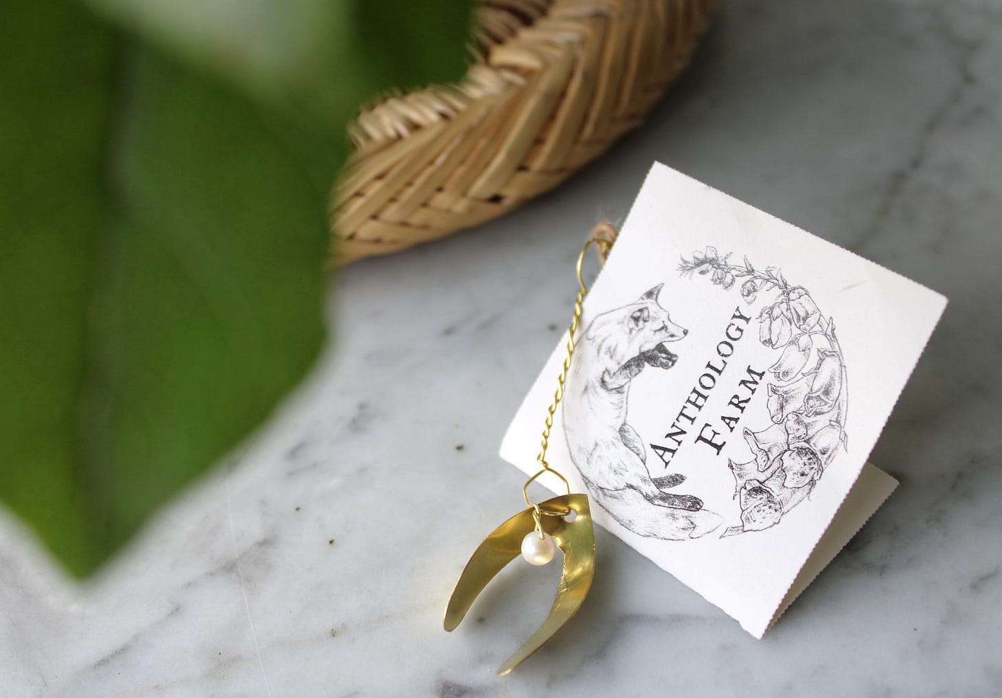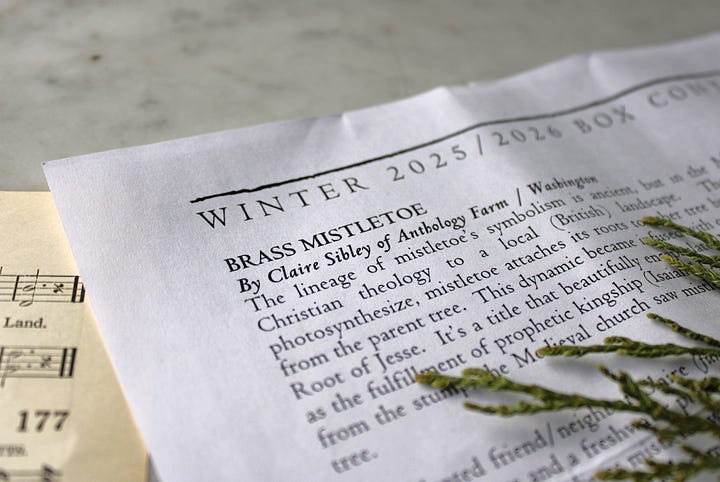 For the winter box, my talented friend/neighbor Claire (fun fact: I designed her farm’s logo!) made a mistletoe sprig with brass and a freshwater pearl...she files and shapes each leaf, twisting each stem by hand. My hope is that this evergreen brass mistletoe would be a reminder of Radix Jesse all winter long...