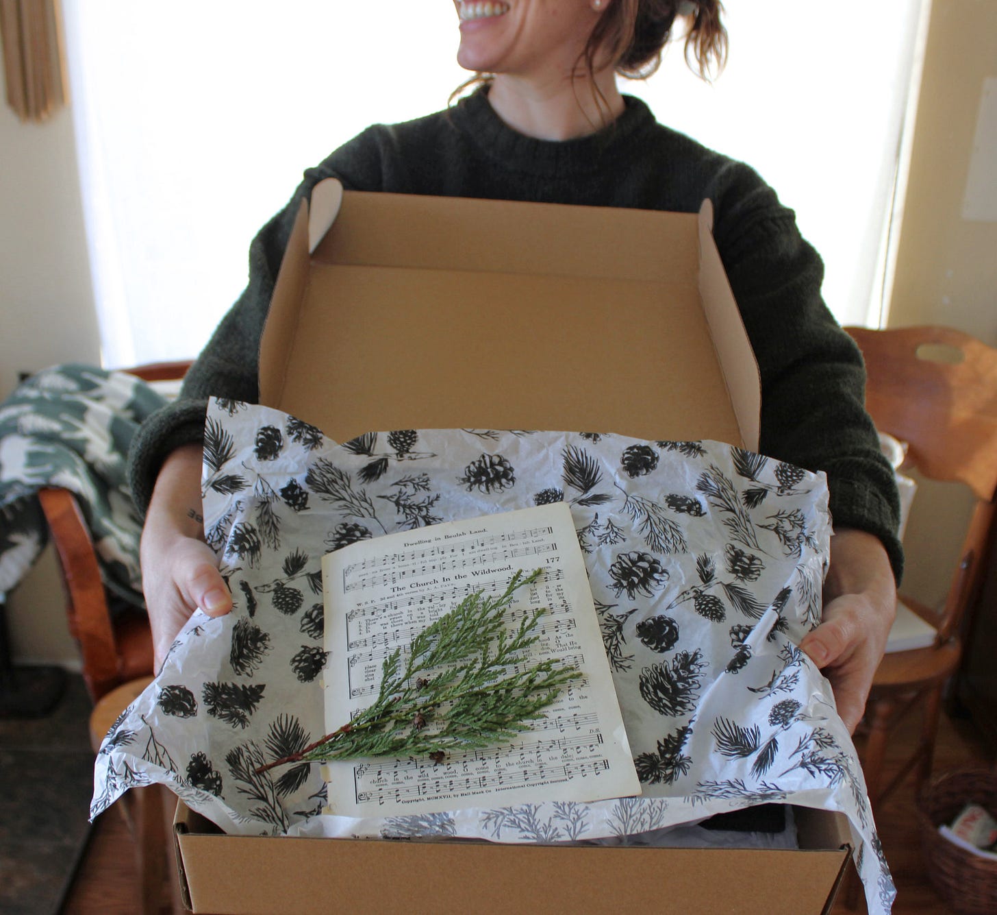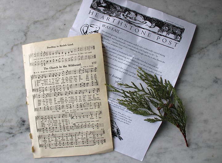 I love rescuing old hymnals that are falling apart at the seams…a bit like a magpie, I keep a tub of ephemera for just the right use. For the winter boxes, I carefully selected each hymn from my pile of rescued pages, so that each of you would have something delicate and meaningful to greet you when opening the box.
