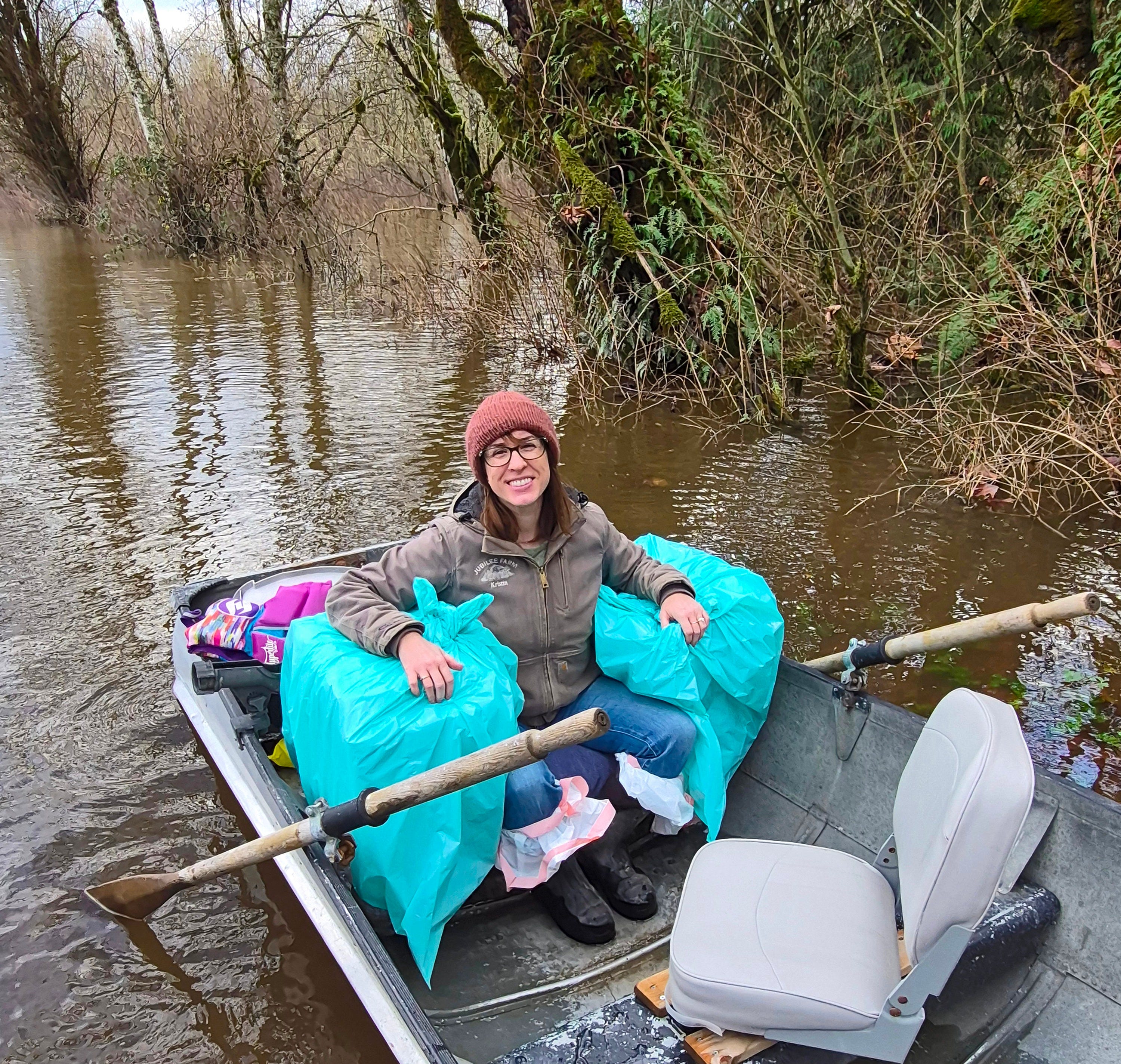 Since we had so many floods in December, shipping these boxes out turned into quite the adventure. I packed them in batches in the wee loft of my studio, printed all their postage, bagged them up to keep them dry, and rowed them up to the hillside (where we park our vehicles during floods).
