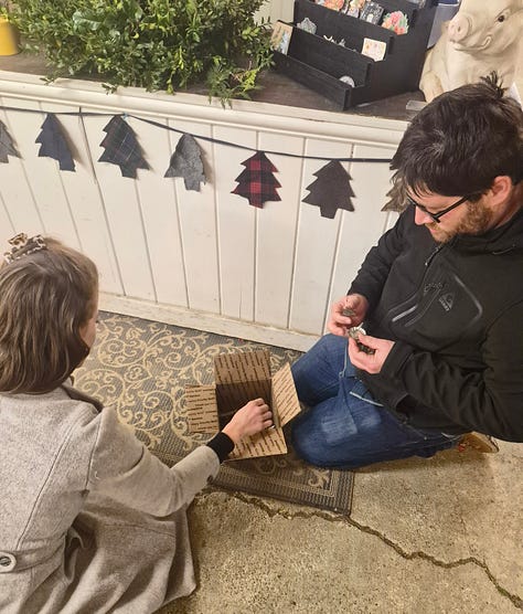 Here’s how your mistletoe arrived to me, as soon as the floodwater had gone down enough: Claire brought this sweet handmade bundle to our porch, and it was personally inspected by our husky, of course (he approved).