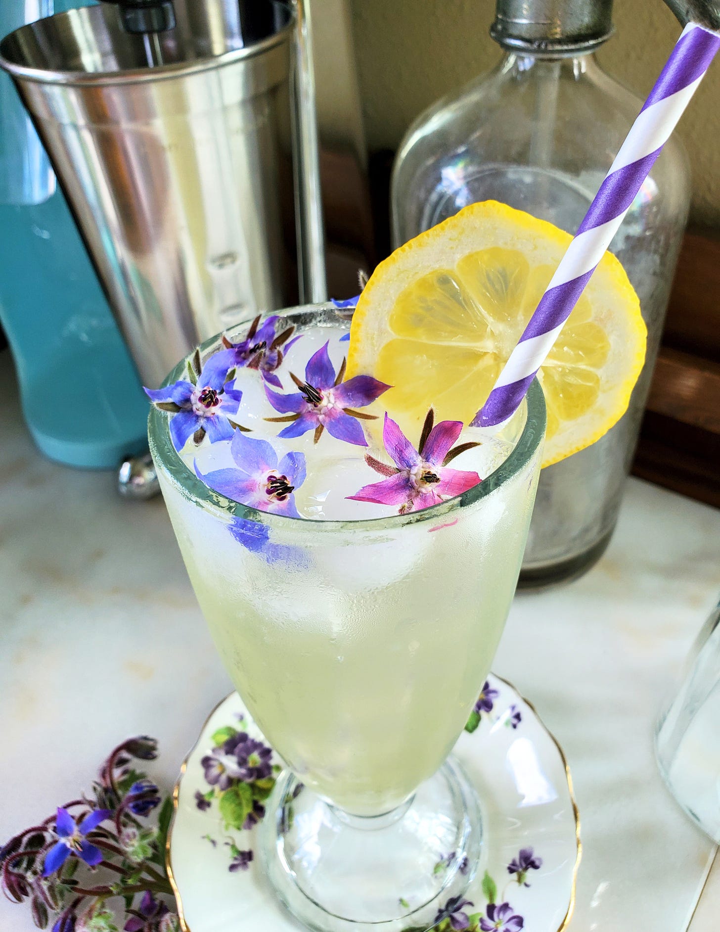 We wandered the rows of flower & herb beds to find another Marian flavor to add - borage flowers were the perfect addition. These beautiful star-shaped flowers, symbolizing courage and humility, range in color from magenta to violet to blue. Also associated with Mary, they call to mind her ancient title of Stella Maris - Star of the Sea. Their light cucumber flavor complements the lemon soda, and they add beautiful pops of color!