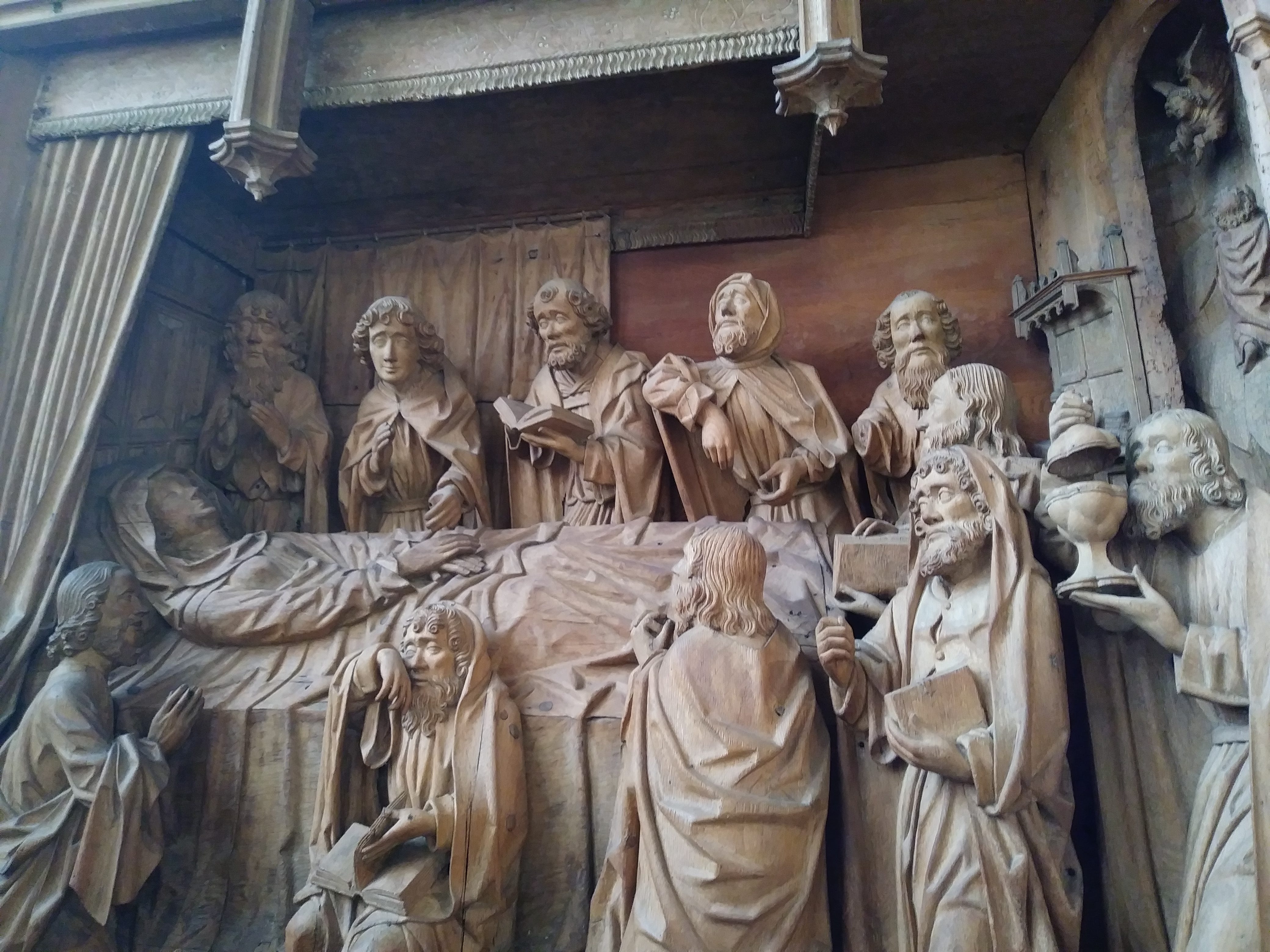 This relief sculpture, once part of an altarpiece, depicts a scene from the Golden Legend (a collection of hagiographies by Jacobus de Voragine, very popular in the late Medieval period). In this tale, the apostles gathered at Mary's deathbed; the sculpture shows St. Peter officiating (he’s holding the book), another apostle sprinkling holy water, and an apostle at Mary's feet filling the air with incense. Only eleven apostles are depicted here; St. Thomas was late. He doubted her Assumption, but then her girdle fell to him from heaven.3